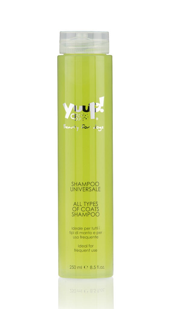 Deze universele hondenshampoo van Yuup! ® is speciaal ontwikkeld voor veelvuldig gebruik en ideaal voor alle rassen en haartypes. Dankzij de voedende formule met aloë vera-extract, schietwilgenextract en propolis reinigt deze shampoo de huid op een bijzonder zachte manier, aangezien deze ingrediënten een desinfecterende en kalmerende werking hebben. Het bevat tevens hydrokeratine en panthenol en is verrijkt met vitamine C en E, waardoor de huid en het haar worden gehydrateerd en de vacht wordt gevoed.