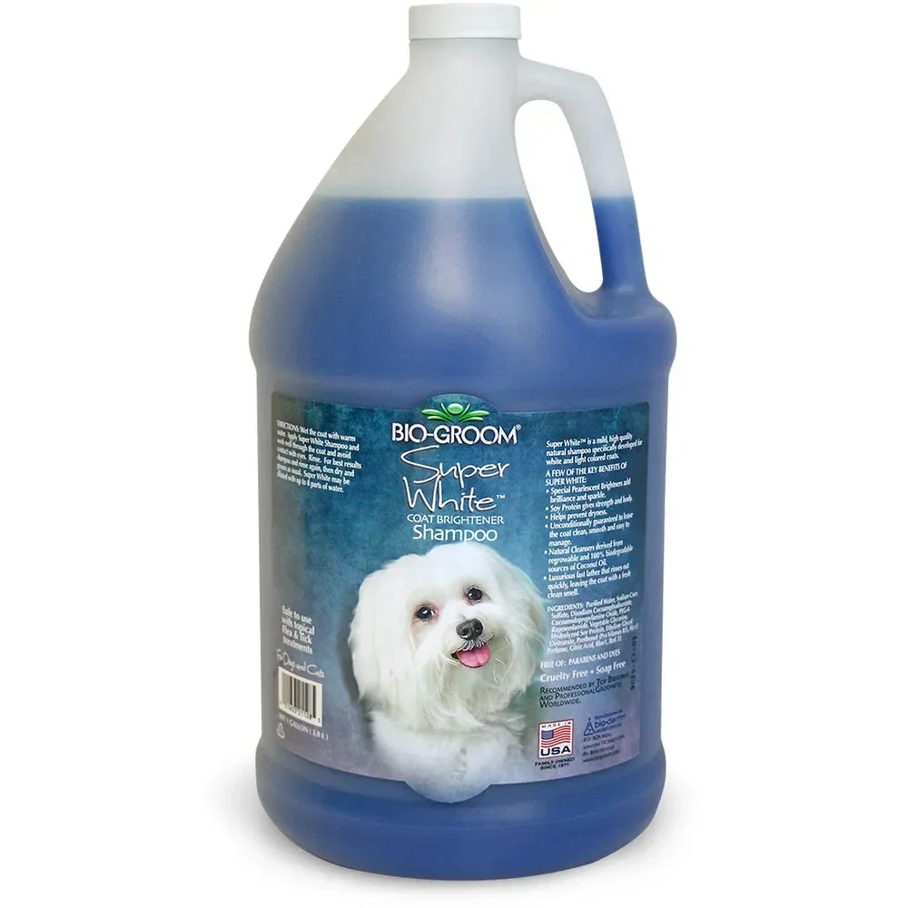 Bio-Groom Super White Shampoo is een shampoo die de natuurlijke haarkleur verheldert, op basis van kokosolie, verrijkt met eiwitten. Het veroorzaakt geen scheuren of irritatie. Een speciale formule met milde bleekmiddelen en een parelglansmiddel intensiveert de kleur van de vacht en geeft deze glans. Het maakt de vacht schoon, glad en gemakkelijk te stylen. De eiwitten en kokosolie in de shampoo verbeteren het uiterlijk van het haar, voeden het, verhogen het volume en voorkomen dat het uitdroogt.
