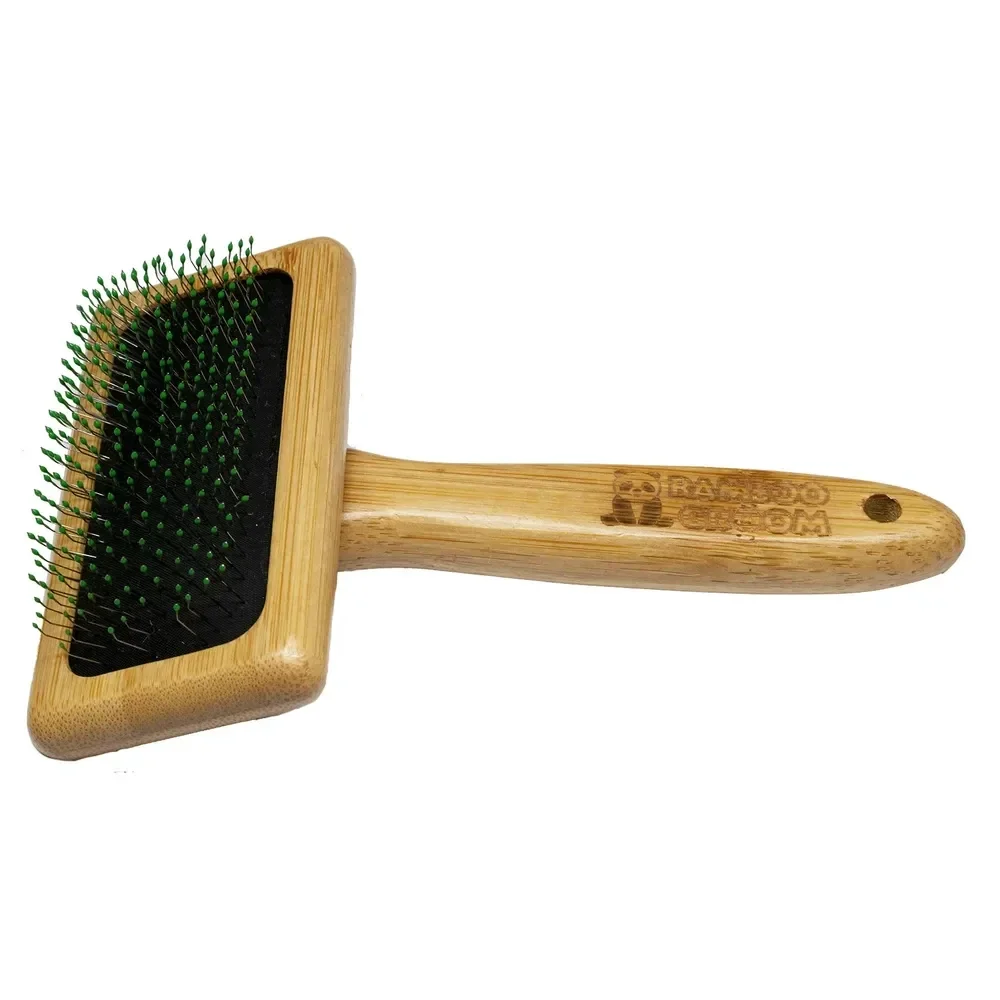Bamboo Groom Soft Slicker Brush Medium werkt zowel goed in een professionele trimsalon als thuis. Deze bamboe Poedelborstel is bedoeld voor de verzorging van middelgrote honden en katten met elk type vacht. Het heeft dunne, gebogen pinnen die de diepe lagen van de vacht bereiken, dode haren en ondervacht verwijderen, fijne klitten ontwarren en de vorming van nieuwe klitten voorkomen. Deze pinnen zijn ingebed in een zacht kussen en aan de uiteinden zitten kleine balletjes. Deze oplossing helpt krassen te voorkomen, wat vooral handig is voor mensen met een gevoelige huid. Regelmatige verzorging van uw poedel helpt het probleem van het verharen te verminderen, waardoor de vacht gezond en glanzend blijft. U kunt ook een borstel gebruiken om volume en pluis aan de vacht toe te voegen. De buitengewone lichtheid van het gereedschap, de ergonomische vorm en het rubberen vingerkussen garanderen een hoog werkcomfort en soepele bewegingen.