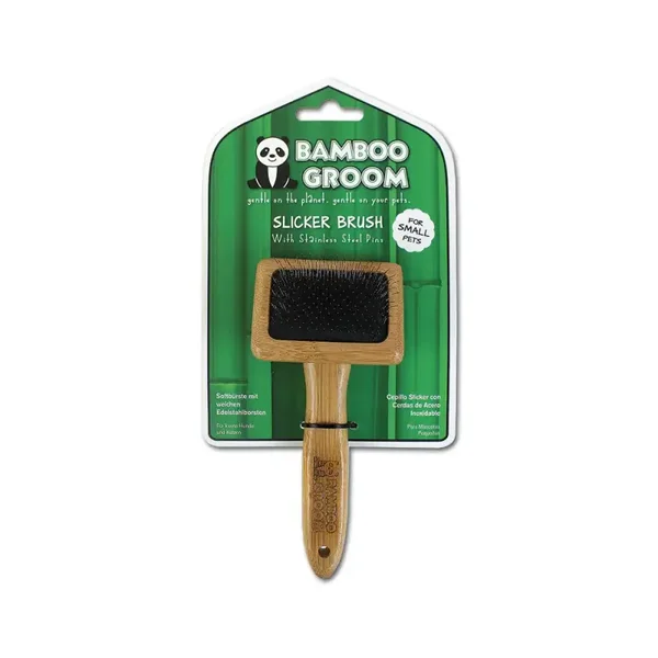 Bamboo Groom Slicker Brush Small werkt zowel goed in een professionele trimsalon als thuis. Deze bamboe Poedelborstel is bedoeld voor de verzorging van kleine honden en katten met elk type vacht. Het heeft dunne, gebogen pinnen die de diepe lagen van de vacht bereiken, dode haren en ondervacht verwijderen, fijne klitten ontwarren en de vorming van nieuwe klitten voorkomen. Regelmatige verzorging van uw poedel helpt het probleem van het verharen te verminderen, waardoor de vacht gezond en glanzend blijft. U kunt ook een borstel gebruiken om volume en pluis aan de vacht toe te voegen. De buitengewone lichtheid van het gereedschap, de ergonomische vorm en het rubberen vingerkussen garanderen een hoog werkcomfort en soepele bewegingen.