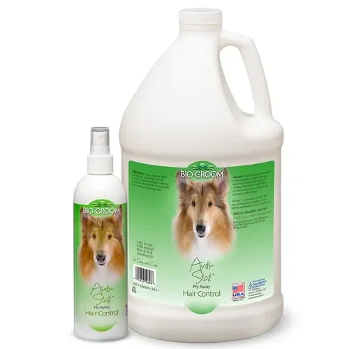 Bio-Groom Anti-Stat is een product met antistatische eigenschappen. Voorkomt dat het haar gaat elektrificeren na het baden, tijdens het kammen en drogen. Dankzij het gebruik van een speciale conditioner geeft het het haar een natuurlijke, zijdezachte uitstraling en vergemakkelijkt het kammen en borstelen. Het laat geen plakkerige resten achter, is niet schadelijk en irriteert de ogen of de huid niet. De voorbereiding verandert de natuurlijke kleur en structuur van de vacht niet. Milieuvriendelijk, biologisch afbreekbaar. Product voor honden en katten.