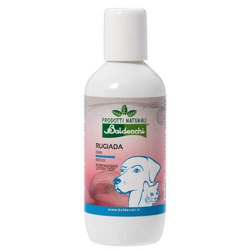 Baldecchi Rosewater Lotion Dew is een preparaat bedoeld voor de dagelijkse verzorging van de mond, ogen, oren en intieme delen van huisdieren . Bevat rozenwater, al eeuwenlang bekend om zijn reinigende, hydraterende en verzachtende eigenschappen. Het preparaat verwijdert perfect vuil, stof en andere onzuiverheden, waardoor de vacht schoon, glanzend en heerlijk geparfumeerd blijft. Het product is gebaseerd op veilige, natuurlijke ingrediënten en bevat geen synthetische kleur- of geurstoffen.