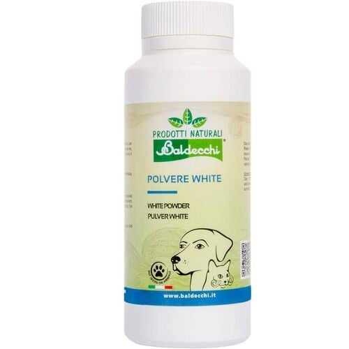 Baldecchi White Powder is een professioneel bleekpoeder, speciaal voor dieren met witte en lichte vacht. De speciale formule ondersteunt de afbraak van aminozuren die geel- en roodachtige verkleuringen in de vacht veroorzaken. Deze cosmetica verbergt lelijke vlekken en verkleuringen op het haar, waardoor uw huisdier er onberispelijk uitziet. Na gebruik is de vacht egaal wit, zonder zichtbare verkleuring. Een ideaal product voor tentoonstellingsrassen die vooral een onberispelijk uiterlijk vereisen. Geschikt voor honden en katten.