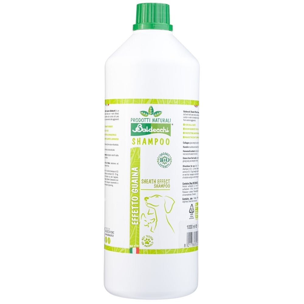 Baldecchi Seath Effect Shampoo is een professionele shampoo met een hoog gehalte aan collageen en keratine, ontworpen voor honden met zwak, dof, broos haar dat intensieve reconstructie vereist . Collageen en keratine zijn een van de belangrijkste bouwstenen van haar; hun sterkte, structuur en elasticiteit zijn hiervan afhankelijk. Door de aanwezigheid van deze twee ingrediënten in de shampoo kunt u eventuele gaten in de vacht van uw huisdier opvullen. Na gebruik wordt het haar sterker, elastischer, zichtbaar herbouwd en voller en elektrificeert het niet. De vacht krijgt zijn vitaliteit en glans terug , is extreem glad en voelt aangenaam aan. Bovendien maken collageen en keratine de reconstructie van de opperhuid mogelijk, dringen ze door in de haarzakjes, voeden ze en zorgen ervoor dat het haar sterker teruggroeit en minder vatbaar is voor broosheid of verlies. De zure pH van de shampoo, die afkomstig is van de fruitzuuresters die aan het product zijn toegevoegd, zorgt ervoor dat u het juiste niveau van hydratatie van de opperhuid kunt behouden, sluit de haarschubben en maakt deze glad. De shampoo is gebaseerd op milde reinigende stoffen die tot taak hebben om de huid en haarstructuur grondig, maar tegelijkertijd zacht te houden, te reinigen van stof en andere onzuiverheden.