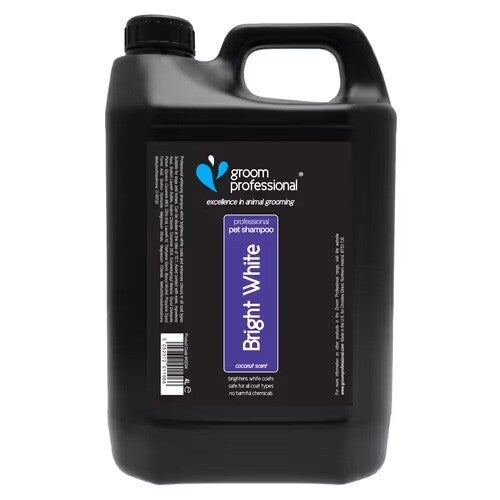 Groom Professional Bright White Shampoo bevat een kleurversterker die de vacht helpt op te helderen en verkleuringen verwijdert. Bevat geen schadelijke chemicaliën of bleekmiddelen. Bevat kokosolie om de huid en vacht te voeden en deze er mooi uit te laten zien. Perfect voor Bichons, Poedels en Westies . Zeer effectief , 1:10 concentraat, samengesteld voor dierensalons, trimsalons en fokkers.